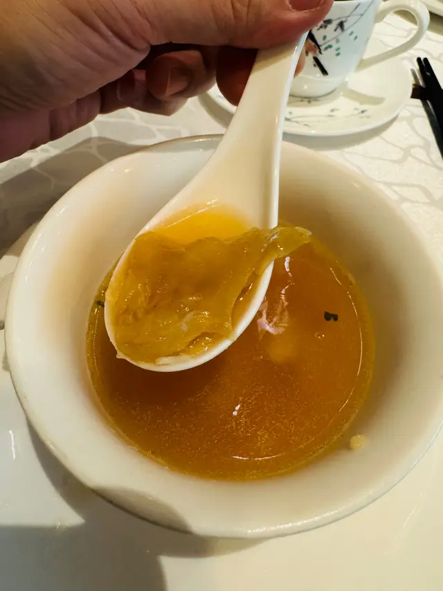 湯底清澈卻味道濃郁,集姬松茸嘅菌香與火腿嘅鹹鮮於一身。內藏軟滑花膠同鮮美雞肉,膠質豐富。