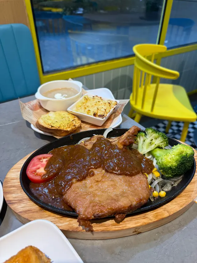 豬扒超厚,食落軟淋juicy,啖啖肉岩曬食肉獸!鐵板餐有配左焗薯仔、牛肝菌湯同蒜香法包,分量連男人都夠食
