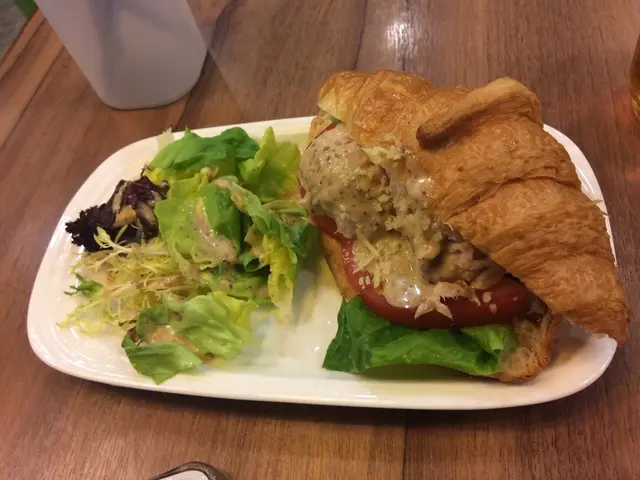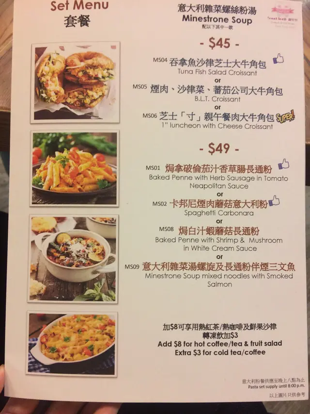 另外叫左個吞拿魚沙律芝士大牛角包連湯$45,再加$8有熱咖啡及鮮果沙律
