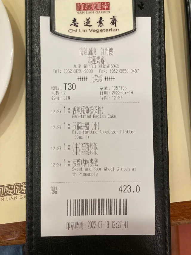 去嘅時候南蓮園池同水車都保固維修工程中,無辦法欣賞到,整體外部環境都好清幽。當日係平日約12:15左右去到,唔洗等就入座。其實我第一次黎,真係唔好當我知規矩,洗唔洗拎飛其實都可以講聲,同埋唔好當人知間舖點樣掃code,入座時明顯啲員工嘅禮貌同態度欠奉。