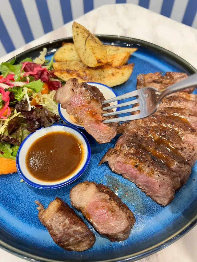 ✩‧₊ 8 oz US Striploin steak with green salad & roasted potatoes ($178)