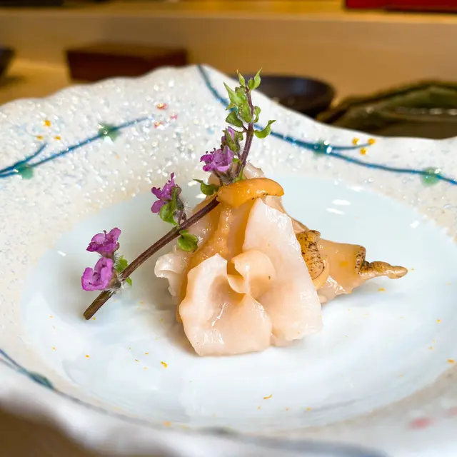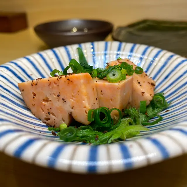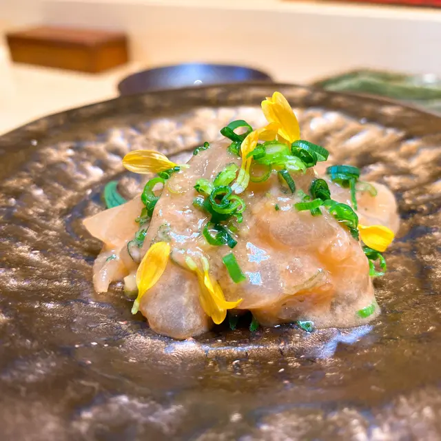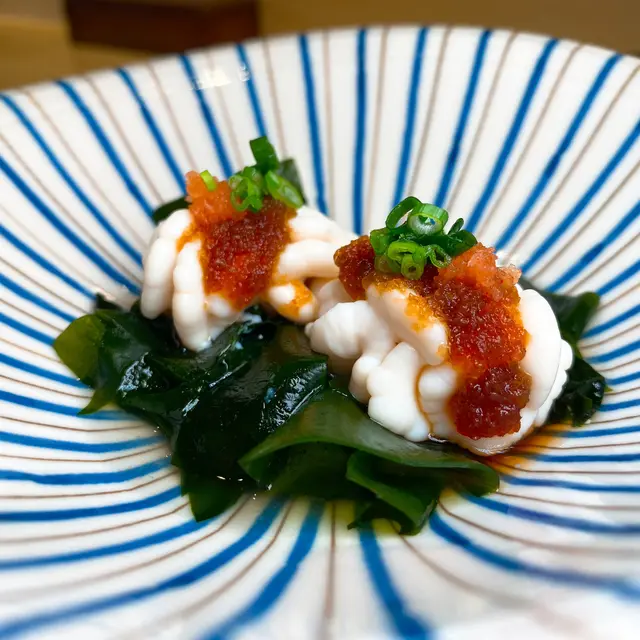 師傅做法特別用心,先用溫熱木魚水淋一淋,令其收縮呈現半生熟,吃落口感似爆珠,在口腔裡爆開的感覺非常獨特,配上酸汁蘿蔔蓉及昆布能有效去除腥膩感。