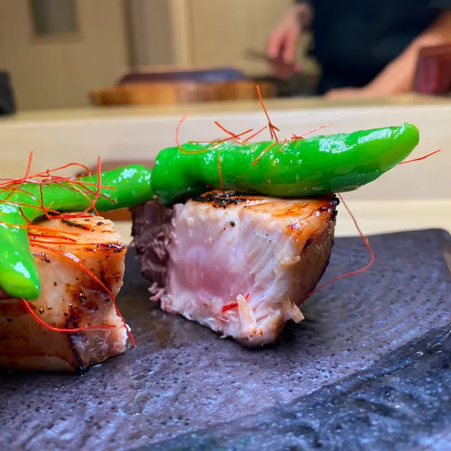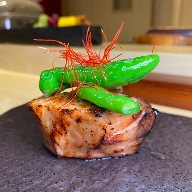 鮟鱇魚肝被譽為海裡的鵝肝,足以證明其身分地位舉足輕重,師傅用了汁煮方法,味道偏甜,馥郁濃香,灑上黑七味粉解一些膩感。