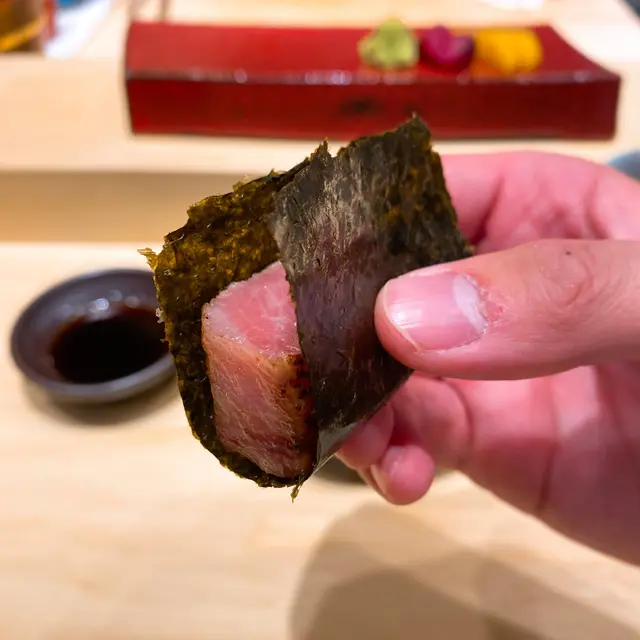 大拖羅明顯地油脂最濃香,脂肪分佈好像雪花般,因為它入口即溶,所以師傅特地用了紫菜包裹,讓油脂在口腔內一次過爆發。