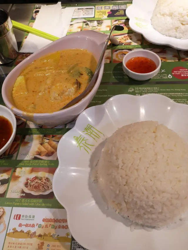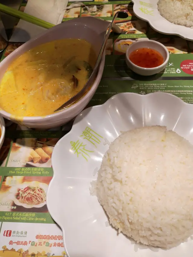 附設嘅白飯真係夠曬份量, 可以選擇白米饭或雞油飯。 白米飯選用泰國絲苗, 勁有米香但唔会好黏糯, 伴以泰式咖哩汁非常非常滋味。