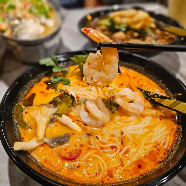 冬陰功湯酸中帶微甜,唔會好辣,除咗蝦之外仲有 秀珍菇及蕃茄,每條Q彈米線沾滿湯汁,啱哂喜歡冬陰功嘅我。