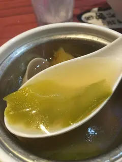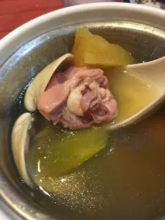 據說燉45分鐘的, 湯質清澈, 但味道好足, 把食材的原味都迫到湯中, 苦瓜及湯甘味而不覺苦, 苦瓜有清熱解毒之效, 實在有益, 燉過湯的雞件比較淡味, 肉質也較粗糙, 其他材料有苦瓜、鳳梨、蜆肉, 非常豐富。