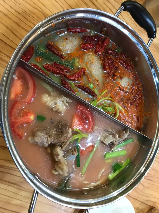 我們先點了一個鴛鴦鍋,番茄豬骨及麻辣湯底,豬骨湯底有濃郁番茄香味,麻辣湯辣味十足。