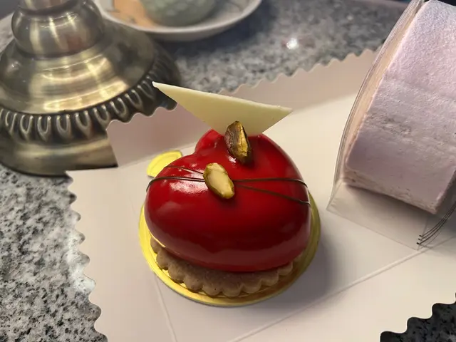將凍餅切開,凍餅的結構一目了然。最外層是醒神、果香濃郁嘅紅桑子慕絲,中層為開心果奶凍(Custard)。入面還配放了幾粒小脆圓餅,令口感更豐富。