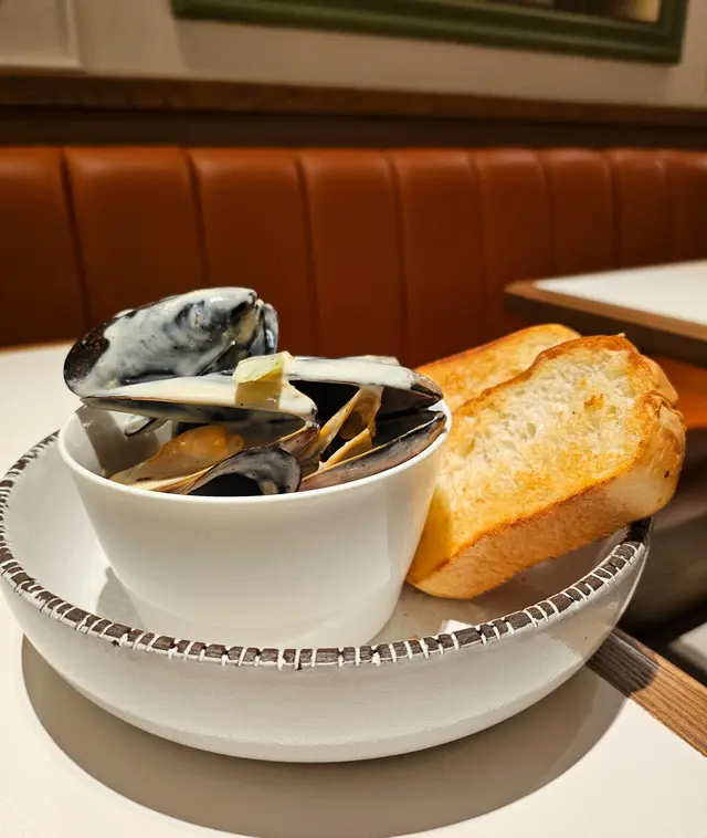 青口肉質飽滿多汁,浸在白酒醬汁中,散發濃郁香氣,沾著麵包吃超滿足😆