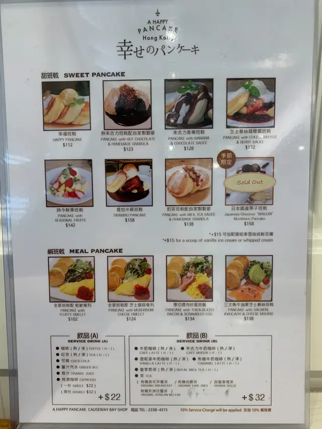 幸福班戟係日本人氣即叫即製班戟,所有班戟係人手烤製。今次餐牌多左兩款甜班戟,所以而家變咗一共有8款甜班戟同4款鹹班戟,款式上其實唔算多。飲品方面選擇都少,主要係普通咖啡同茶。