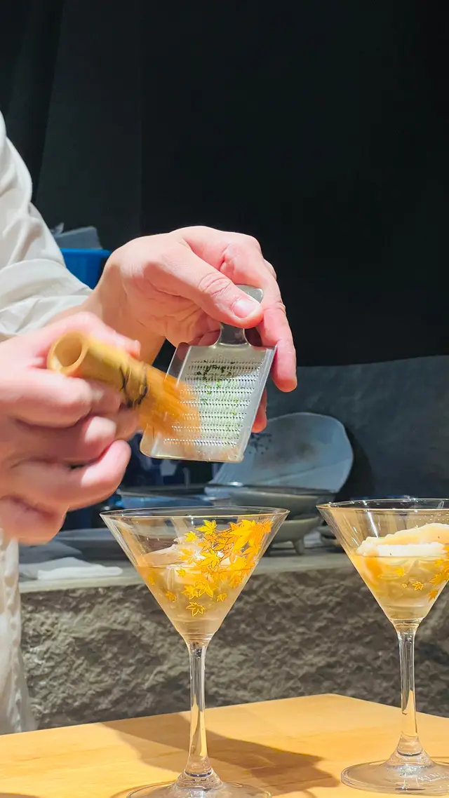 🥕每次食 #Omakase,就好似睇緊一場表演一樣🤩 面前嘅師傅刀工一流,冇諗過徒手就可以將原條 #黃蘿蔔 片成蘿蔔片,再切幼粒,最後混入鮟鱇魚肝同法包🥖一齊食,充滿魚肝香氣、口感豐富!