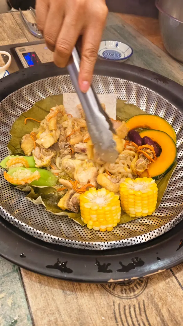 蟲草花蒸雞配烏冬 + 時蔬四款:份量十足,雞肉滑嫩,烏冬吸收精華