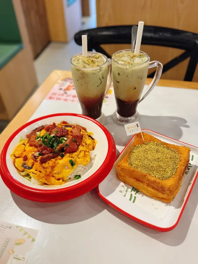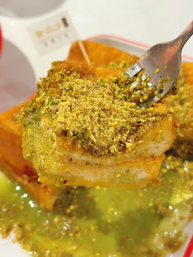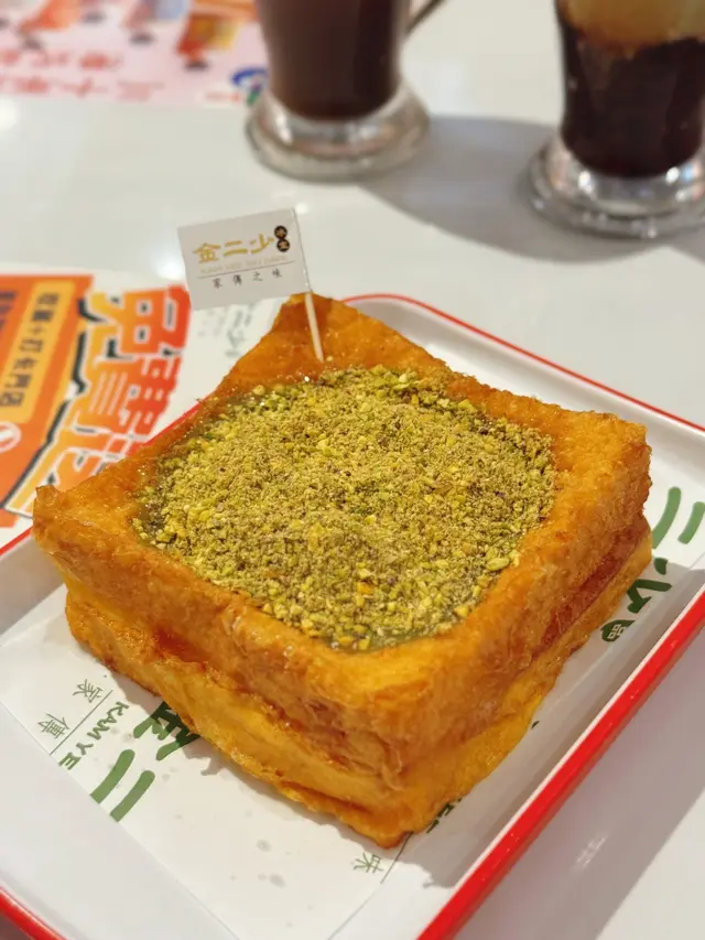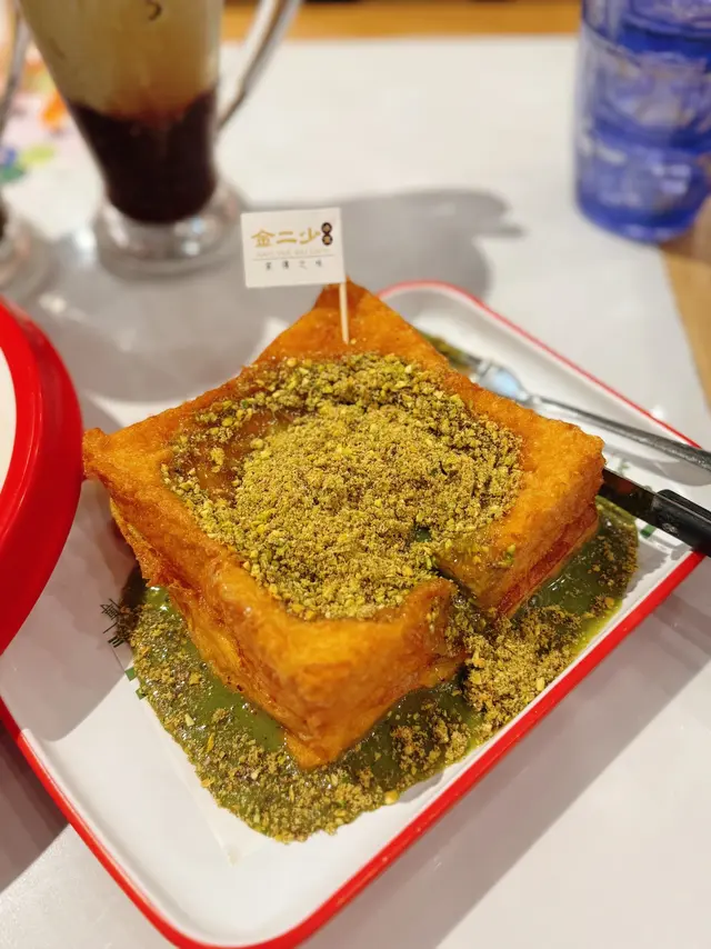 終於吃到這個在網路上洗版的開心果西多士啦!實物比想像中還要更多更多的開心果份量啊~ 西多士厚厚的又炸得夠金黃色,表面鋪滿開心果碎跟開心果醬,散發著非常濃郁的開心果香氣;切開更是讓人瘋狂!因為是滿滿的流心開心果醬!以開心果醬代替傳統的花生醬,其實別有一番風味,喜歡吃開心果的朋友就當然是不能錯過啦~ 因為實在是太濃厚的開心果味道,完全是大滿足啦!店家還推出了兩款開心果特飲,是混合了茶餐廳的經典跟新派飲品:開心果華田和開心果紅豆奶茶!沒想到阿華田跟開心果出奇地夾,香甜之中帶果仁香;而後者更是層次豐富,茶醇夠滑,滲出淡淡的紅豆味,再配開心果的堅果味道,不會太甜啊!
