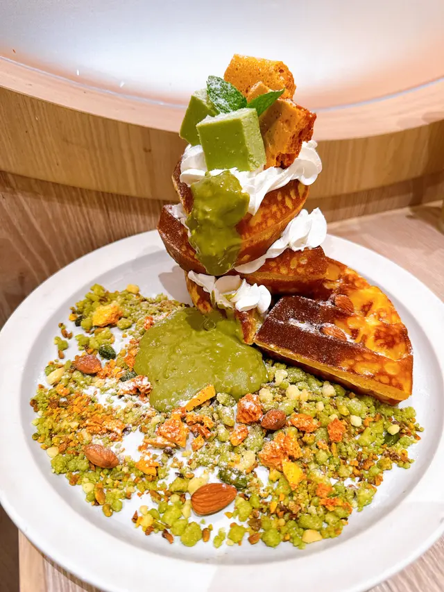 窩夫上淋上開心果醬,底下鋪滿開心果碎,加上甜甜嘅蜜糖及焦糖脆脆,食完真係好開心,完美作結!