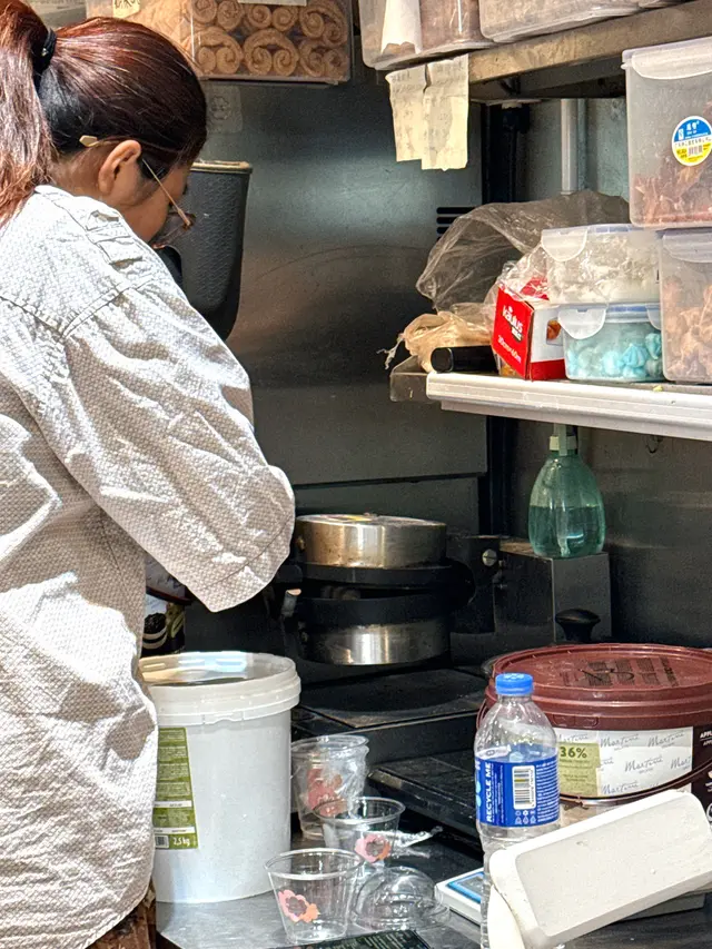 窩夫焗得鬆脆, 加上大量乳酪雪糕, 熱辣辣窩夫令雪糕更快為半溶狀態, 令人更急不及待大口大口咁食, 配上芒果肉同埋芒果醬, 甜酸開胃。新鮮即焗窩夫仲係天后店獨有, 一定要試!