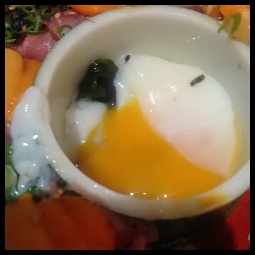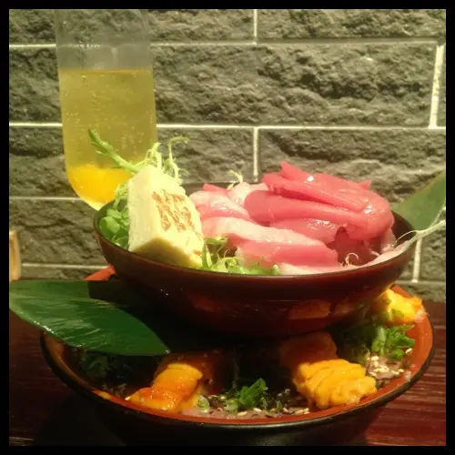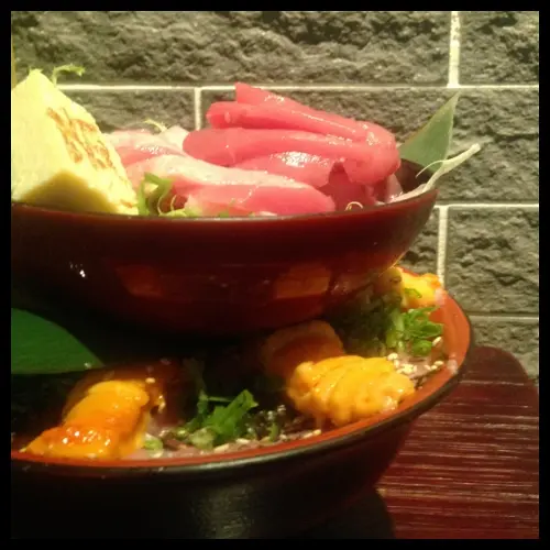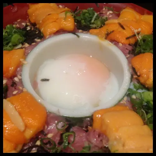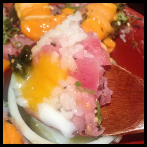 下層中間放了一隻溫泉蛋,圍在外圍的則是滿滿的吞拿魚蓉和我的最愛--金黃的海膽。刺生的份量多到把下面的米飯都蓋住了。
