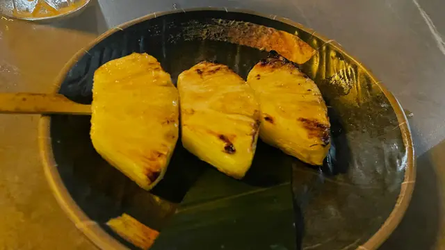 接下來是燒菠蘿。這道菜的創意令人驚艷,菠蘿經過燒烤後變得更加香甜多汁。外層的焦糖味道與菠蘿的鮮甜口感形成了絕佳的味蕾對比,讓人忍不住一口接一口。