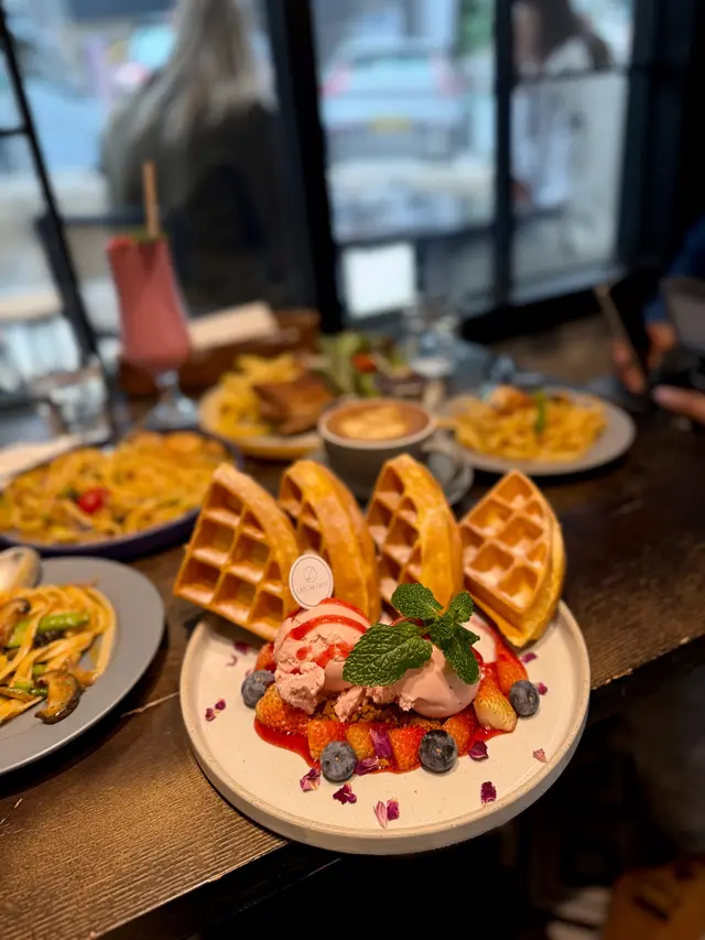 飯後來一客精緻窩夫吧~自家製厚底帶鬆化,伴上香甜新鮮士多啤梨 & 雪糕球,甜蜜在心頭。