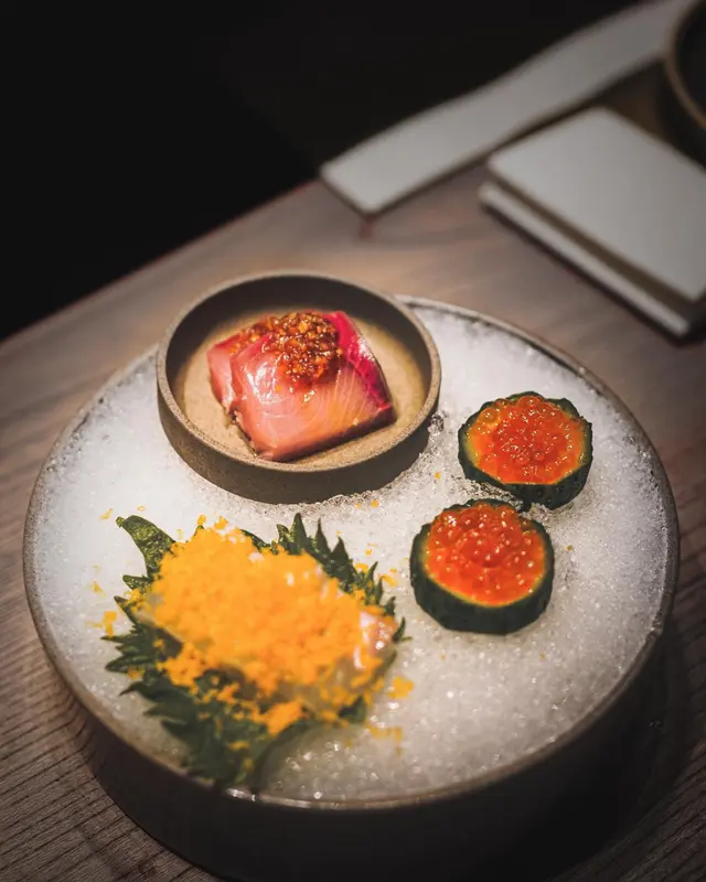 無奈疫情下,餐廳需於六時關門。因此, Menu也作出了適當的調整,減少了菜式的選擇。是次,我們點了一道「Chef’s sashimi」三色刺身作為頭盤,這道三色刺身包括了油甘魚,三文魚子,和鯛魚。有別於一般的刺身,每道刺身的Seasoning 都帶有一點Twist,例如鯛魚刺身配以鰹魚乾作為Topping,清新的魚生,帶點輕微的鹹味;而油甘魚則以少量的辣醬配搭,為味蕾帶來適當的衝擊。