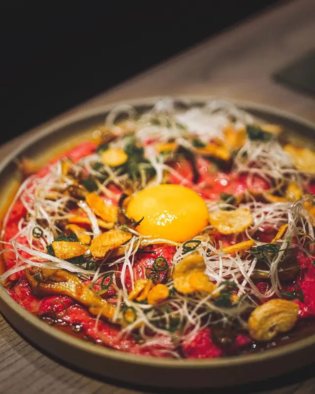 主菜方面,是此餐廳其中一道最有名的餸菜「Kagoshima beef sukiyaki」和牛壽喜燒。此道菜式的特別之處是,和牛並不是輕熟,而是生吃,配以醬汁,蔥絲和炸蒜等材料與和牛混在一起,和蛋黃攪勻,不但能夠吃到和牛濃香的牛肉和油脂味,其他配料更能令牛肉入口後的口感和味道變得更豐富,把整道菜式昇華至另外一個層次,滿口幸福的感覺。