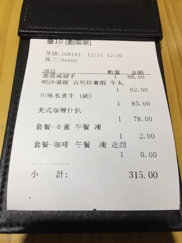 餐枱整齊清潔, 坐位闊落. 看看餐牌, 午餐款式選擇良多, 從台灣的肉燥飯到法式意粉都有供應. 可能是心情大好的關係, 點了德國咸豬手, 川味水煮魚, 咖喱什扒飯及喇沙湯麪.