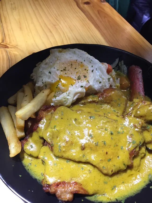 咖喱什扒飯份量十足, 配有雞扒, 豬扒, 腸仔, 煎蛋, 薯條及蔬菜. 肉類及煎蛋皆香口, 蔬菜新鮮. 最為令人回味的是加入了香草的咖喱, 甜香但不辣.