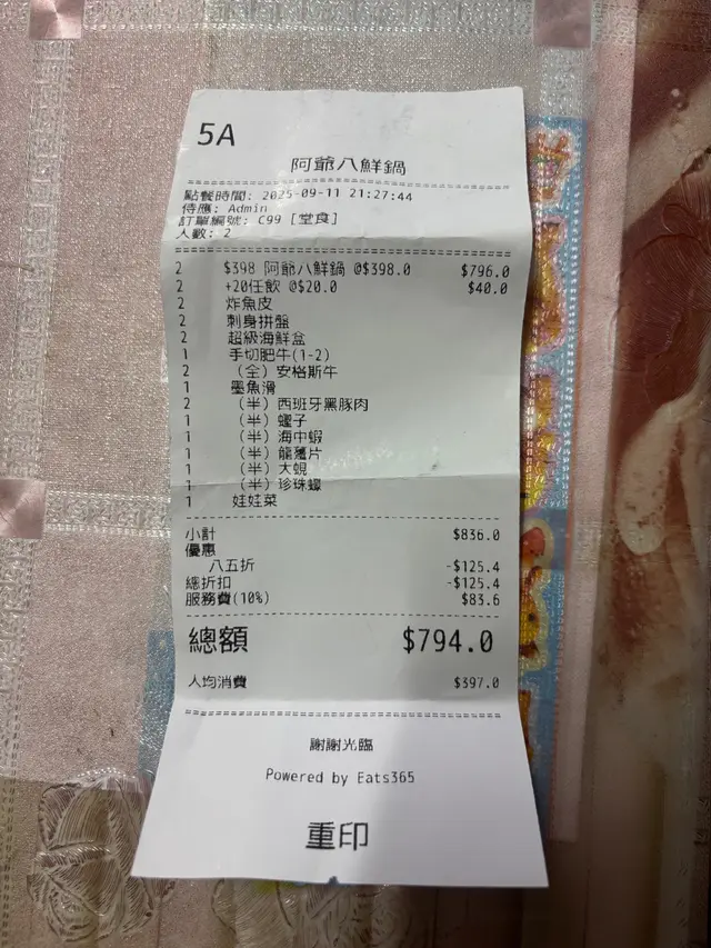 我哋係9點後入場$398一位,全單八五折(只限星期日至四),呢個價錢有刺身拼盤+2.5小時任食雞煲、新鮮海鮮放題、燉湯等。另外+$20 就可以任飲,仲有啤酒揀,真心覺得物超所值!