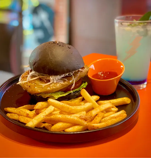 PAN FRIED SICHUAN CHICKEN BURGER WITH CHIPS($138),用上黑色竹碳漢堡令外型更加型格,雞扒大塊又厚身,肉質鬆軟夾住蕃茄、生菜味道多汁 。最特別的是漢堡加了四川麻辣風味的原素,初時入口微微的辣,之後的麻辣味道又幾有後勁,味道非常過癮。粗薯條