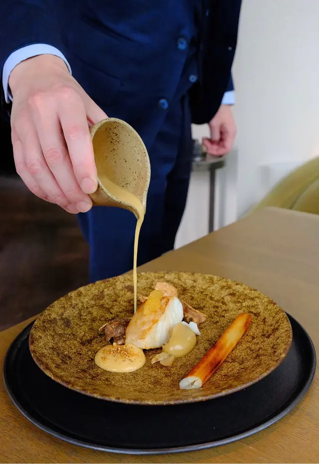 主菜之一係用本地三黃雞,雞肉嫩滑。配搭嘅日本醬油同黑松露幾香,旁邊嘅蘑菇雞汁味道濃厚,而脆雞皮就增加咗口感