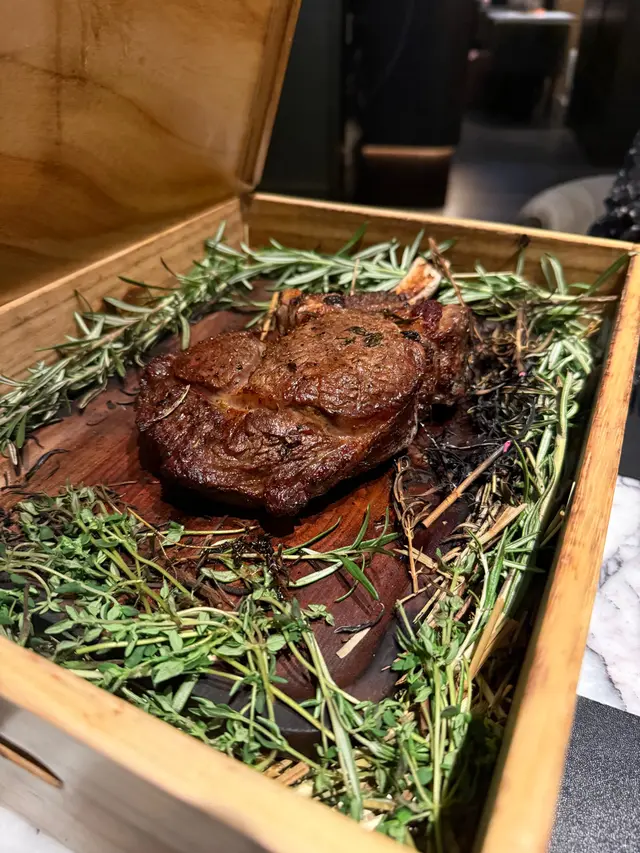 到主角,加了錢,Grain Fed Prime Rib (+$440),出場已好有驚喜。一個煙燻木盒俾大家睇同打卡,真係好靚,唔止靚煮medium 煮得恰好,粉紅肉色,好食好睇。當服務員打開煙燻木盒的一刻,那陣煙霧繚繞的視覺效果確實令人印象深刻,不愧是Instagram-worthy的呈現方式。