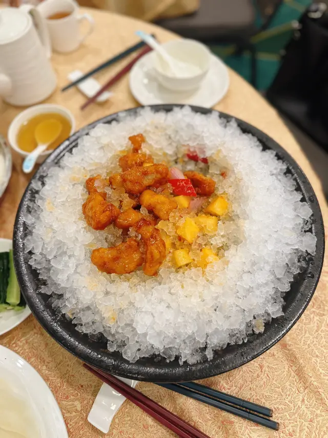 再來同樣是打卡名物!早在網絡上已看到這道菜有多誇張⋯ 咕嚕肉放在超大盤冰上而且冰量多得近乎完全覆蓋著肉,才知道這樣做是別有用心,冷卻了的咕嚕肉醬汁變硬成為脆口的糖衣,入口冰凍內裡仍然保持熱度,非常有創意!咕嚕肉味道酸甜可口,肉夠腍滑又有肉汁,感受到有肥瘦相間的感覺,吃起來口感真的很好;加上配料如新鮮菠蘿、彩椒等,吃起來就相當豐富