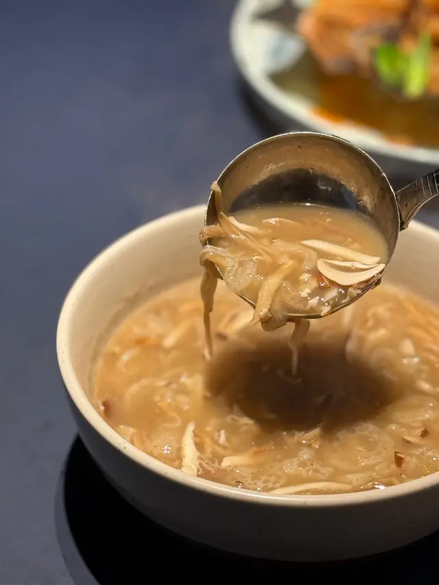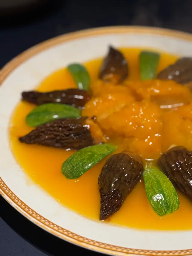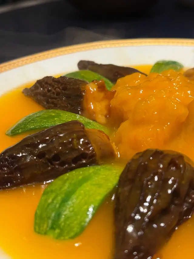 個羊肚菌釀入蝦膠夠晒彈牙,令我忍唔住食完一舊又一舊🙌🏻不過最特別係中間嘅「金耳」,我原以為係花膠嚟架!金耳係雲南有「耳中貴族」之稱👑可以美容養顏、滋補養生,潮江春加埋南瓜金湯,更加鮮甜☺️