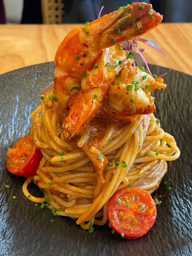 呢個賣相好靚,兩隻虎蝦肉質彈牙,意粉煮得啱啱好有少少咬口,紅咖喱味都香,偏辣少少,但無特別值得食🙈