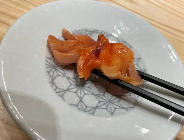 廚師用刀把赤貝𠝹至八爪魚形狀,並在表面放上靜岡柚子皮,柚子味十分出眾,帶出清香口味,爽滑有嚼口。