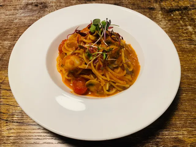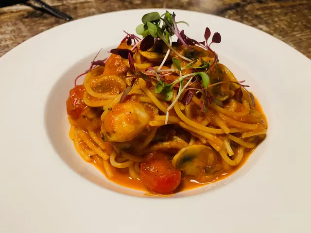主菜香煎日本帆立貝蕃茄醬義大利麵,番茄的酸甜相輔相成,裹滿了醬汁的義大利面口感更加豐富;