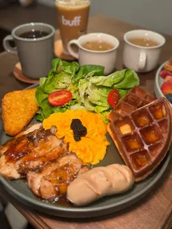 - 超豐富,雞肉肉質嫩,水準唔錯。仲有窩夫配上蜜糖,幾香口