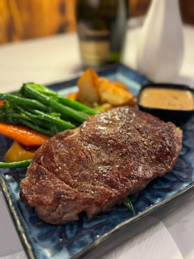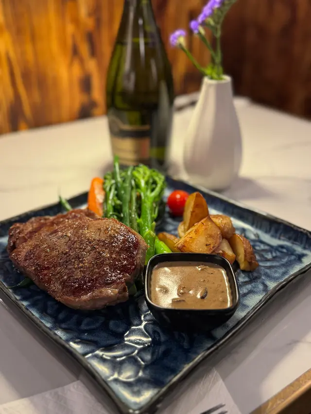 可選擇蘑菇醬汁或者黑椒醬汁,牛排肉味濃郁,medium熟度口感嫩滑,配烤薯仔🥔和蔬菜🥕🥦等,烤薯仔外皮微脆,內裡軟綿,西蘭花、胡蘿蔔等保持爽脆,無過多調味,個人非常欣賞