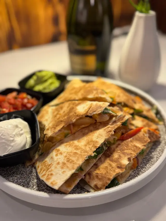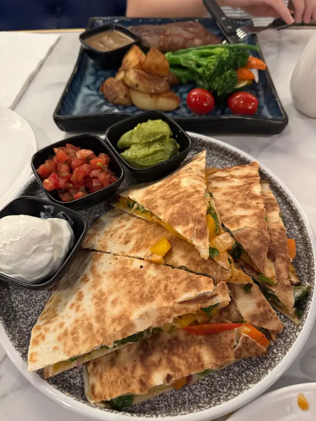店員已經講咗份量偏大,但係我哋太低估自己嘅肚量以為食得晒,結果睇到上碟份量都0曬嘴,真係好多,有8塊夾餅,好似一個large pizza,有芝士🧀加蕃茄洋蔥🧅磨菇等各款素菜,本身已經好味,配莎莎醬、酸奶油和牛油果🥑醬,勁推薦牛油果🥑醬