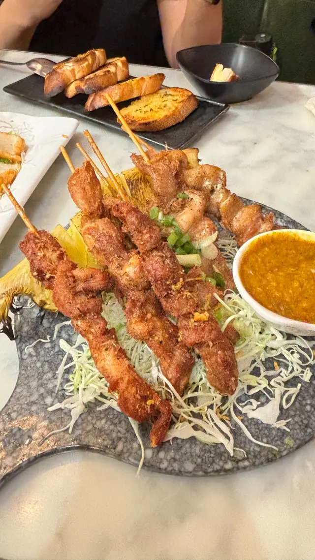 沙嗲串燒拼盤:雞豬串燒到焦香微脆,沙嗲醬花生味濃鎖肉汁;菠蘿燒到爆汁解膩,8串份量抵食。