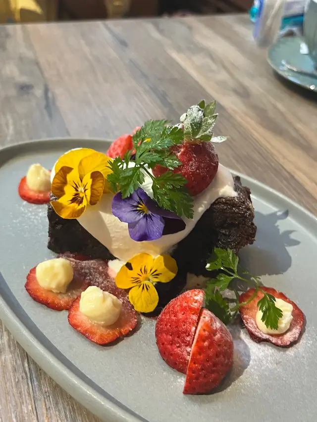 布朗尼質感有少少似鬆軟嘅蛋糕,勝在唔太甜,同樣有好多草莓🥰