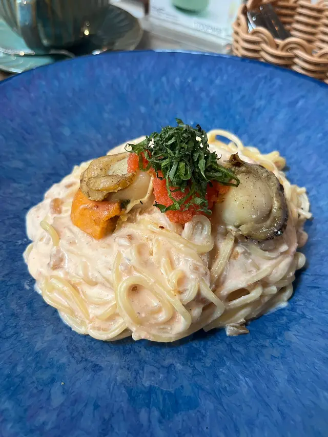 有兩大粒帆立貝,意粉份量都相當多 掛滿明太子忌廉醬,香辣creamy
