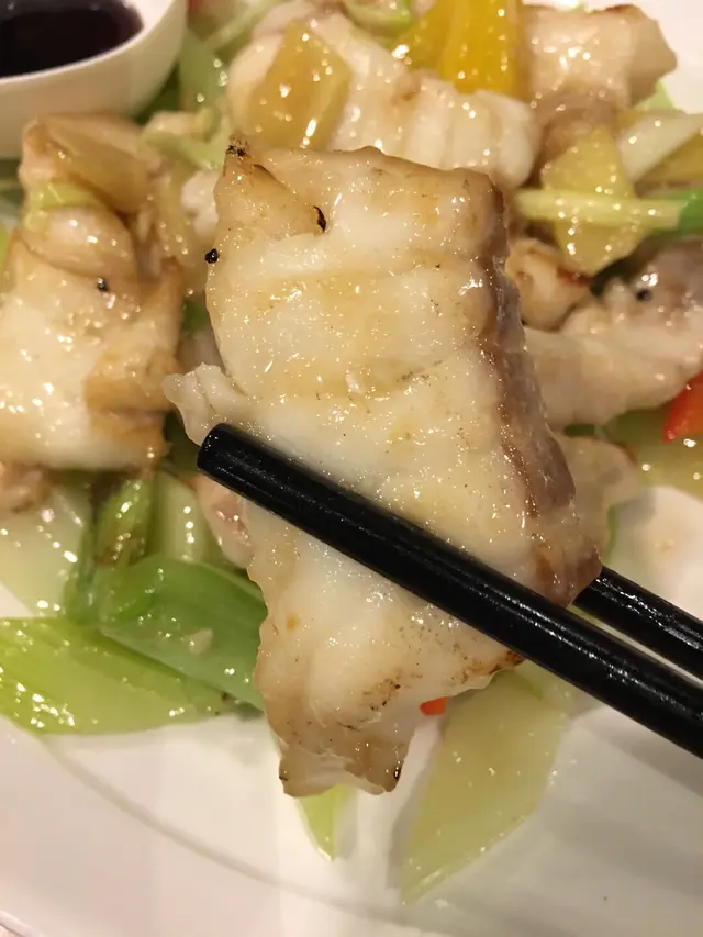 每件龍躉球的魚皮及魚脂去除得非常徹底,完全沒有任何魚腥味;但魚球炒得稍為過火,肉質有點粗糙。魚味也只是一般,不夠鮮甜。