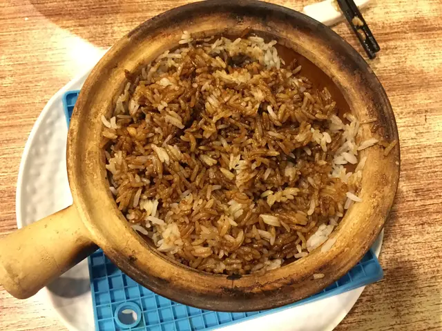 再將餘下的半碗豉油淋在飯面。拌勻所有豉油、煲仔飯及飯焦,顏色非常均勻,每顆飯粒表面泛起油光。飯粒分明、沒有互相黏結在一起;每一啖飯咬落口軟硬適中、味道鹹甜均衡。整體來說,是一個非常美味又可口的煲仔飯;需要改善之處就是太過油膩,煲飯時候加了過多的食油,煲仔飯豉油同樣落了過多的食油。