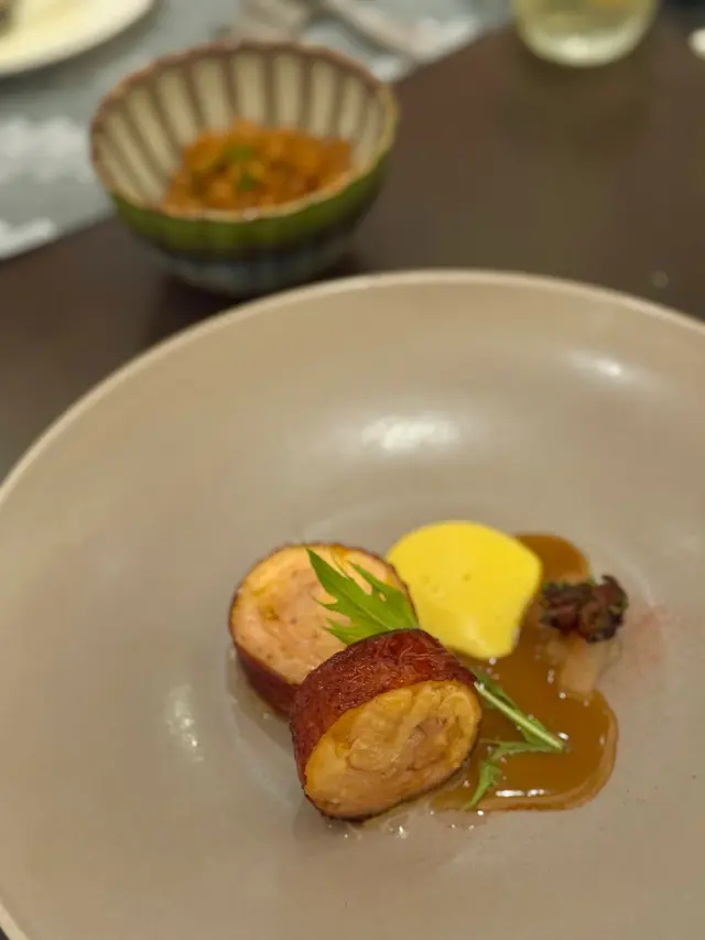 週末只有一個set可以點,六道菜加一杯飲品,每人$298,飲品檸檬加氣泡水,幾清新;麵包酥中帶軟有牛油香,斑蘭醬略甜;前菜有紅蝦、炸雞同立鱗燒,紅蝦嫩甜味道恰到好處、炸雞金黃香脆好多肉汁仲帶少少麻辣味道、立鱗燒用馬頭魚配酸辣魚湯,燒到外皮香脆,魚肉緊緻入味,醬汁味道有層次