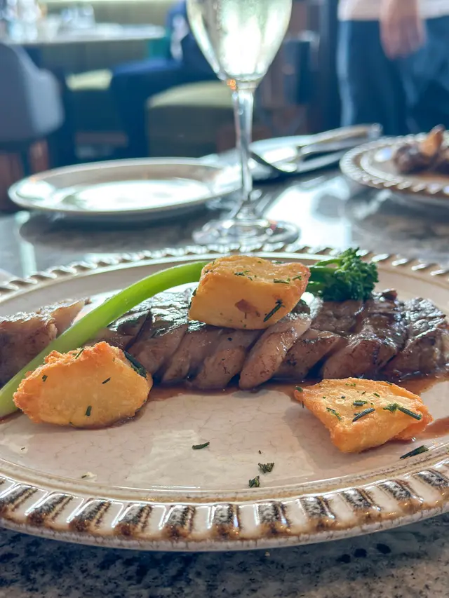 USDA Prime西冷牛扒(200g)火候完美,外層焦香內裡粉嫩,配紅酒汁昇華肉味!迷迭香馬鈴薯吸盡肉汁精華~ 而澳洲M7+牛臀肉(150g)更驚艷!草飼牛肉味濃而不膩,綠胡椒醬微微辛辣吊出肉香,油封蒜入口即化正到震!