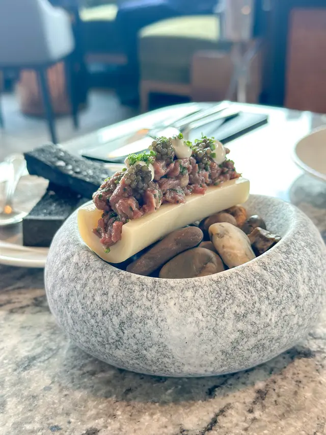 三文魚他他賣相精緻,新鮮三文魚粒拌柚子清香,酸豆同蘿蔔絲帶出清爽層次,開胃首選!另一道法羅沙律更得意,蜜桃甜香撞埋酸越莓乾,松子脆口得嚟夠健康,朋友話想encore多份!