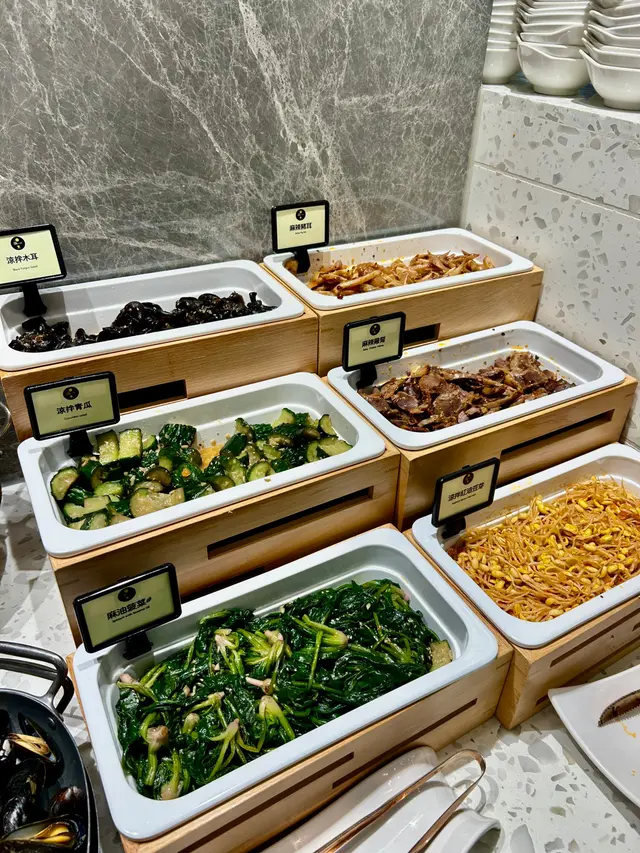 自助吧有各式各樣嘅食物,有多款開胃涼菜,涼拌木耳、青瓜、麻油菠菜、麻辣豬耳、雞腎、紅油豆芽等……。