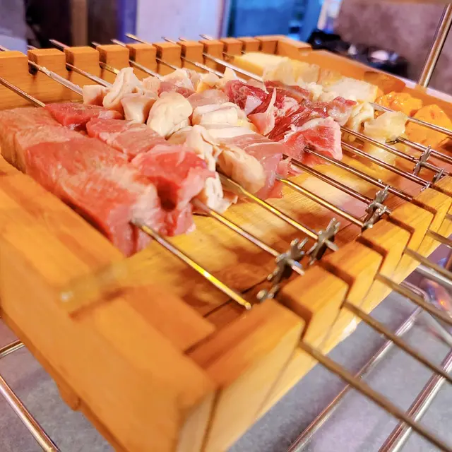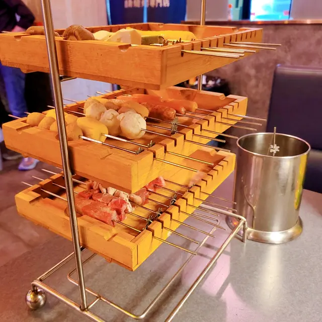 串燒店是自助任食的, 肉類 (豬牛羊雞均有), 菜類菇類, 少量海產, 綿花糖, 菠蘿🍍, 連雞蛋仔都有, 對我而言種類還算可以。不過下單以人頭計, 即假如二人計, 每次下單每款食物最多只可下二人份, 想再叫就要再一次下單, 這個稍為不便。環境都算寬敞, 感覺也很整潔, 有一個中雪櫃在中央, 可以任意飲用。