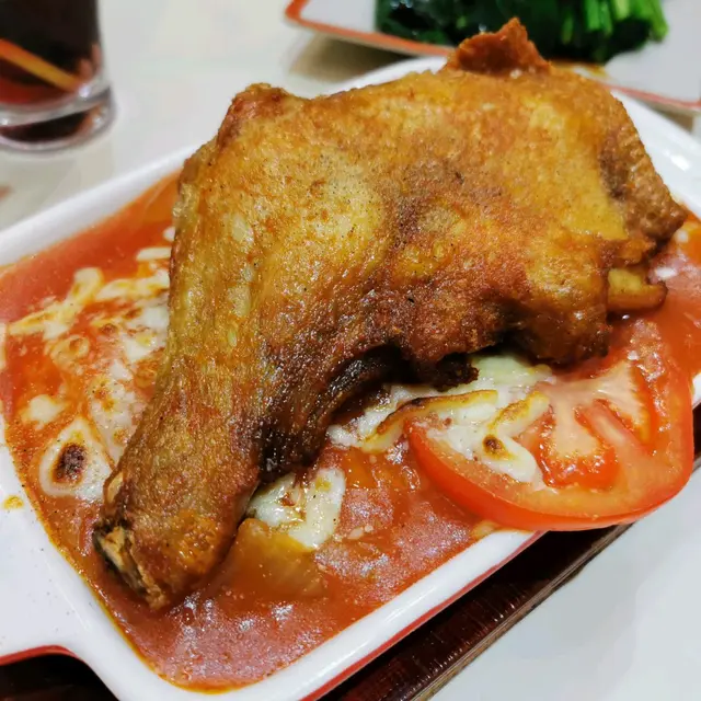 芝士鮮茄焗炸雞睥飯有點誇張,雞脾很巨型,鮮茄醬下還有炒底飯,是用心佳作。